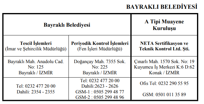 Asansör periyodik kontrollerine ilişkin usul ve esaslar, Sanayi ve Teknoloji Bakanlığı tarafından 04/05/2018 tarihli ve 30411 sayılı Resmî Gazete’de yayımlanmış olan Asansör Periyodik Kontrol Yönetmeliği ile belirlenmiş bulunmaktadır. Bahsi geçen Yönetmelik gereği, ilçemiz sınırları içerisindeki tüm asansörlerin yılda en az bir defa periyodik kontrollerinin yapılması maksadıyla 14/10/2024 – 14/10/2029 tarihlerini kapsayan 5 (beş) yıllık dönem için, Bakanlık tarafından yetkilendirilen A tipi muayene kuruluşlarından birisi olan NETA Sertifikasyon ve Teknik Kontrol Ltd. Şti. ile idaremiz arasında 04/10/2024