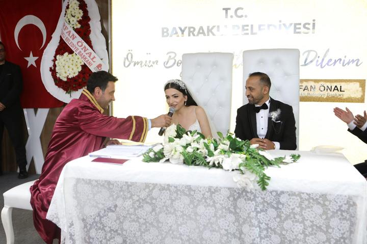 Bayraklı Belediye Başkanı İrfan Önal, belediye başkanı seçildikten sonra ilk nikahlarını kıydı. Genç çiftlerin ve sevenlerinin heyecanına ortak olan Önal, "Bayraklı Belediye Başkanı olarak ilk nikah akdimizi gerçekleştirdik. Çiftlerimiz ve tüm davetlilerin mutluluğunu hep birlikte yaşadık. Gençlerimize ömür boyu mutluluklar diliyorum" dedi.