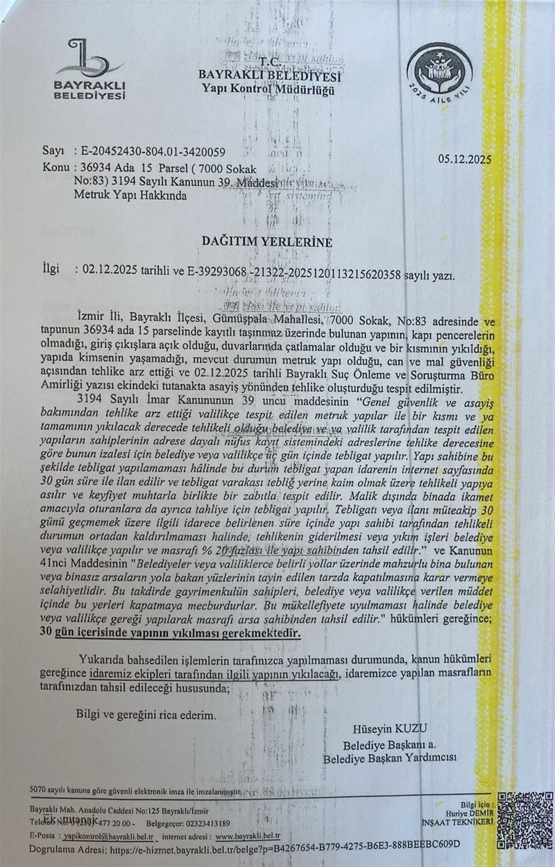 36934 Ada 15 Parsel (7000 sokak no:83) 3194 sayılı kanunun 39. maddesi metruk yapı hakkında