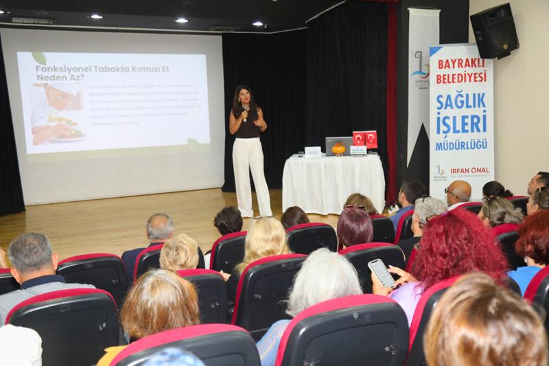 Bayraklı Belediyesi Sağlık İşleri Müdürlüğü tarafından Osmangazi Hizmet Binası Konferans Salonu’nda gerçekleştirilen seminerde, İzmir Büyükşehir Belediyesi Eşrefpaşa Hastanesi Fonksiyonel Tıp Diyetisyeni Aycem Pehlivan, uzun ve kaliteli bir yaşam için yapılması gerekenleri anlattı. Seminere Bayraklı Belediyesi meclis üyeleri ve çok sayıda vatandaş katıldı.