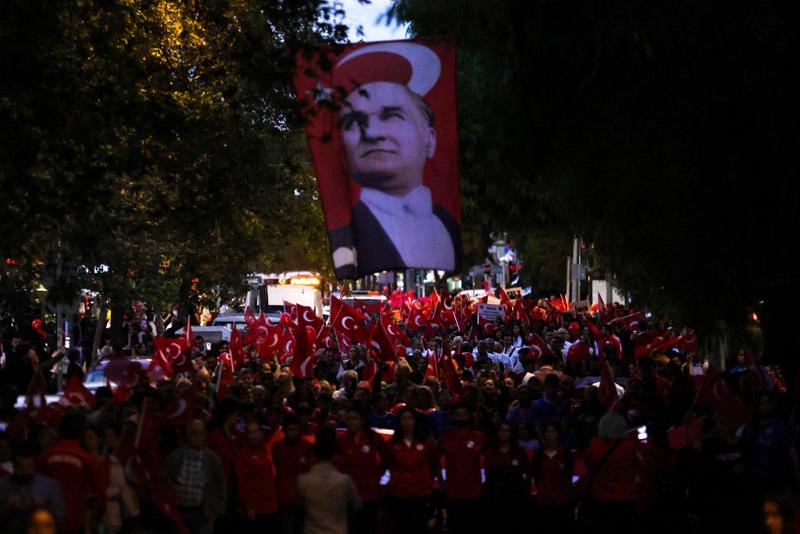 Bayraklı’da 29 Ekim Cumhuriyet Bayramı’nın 102. yılı, kortej yürüyüşü ve konser programıyla büyük bir coşkuyla kutlandı. Özkanlar Migros önünden bando eşliğinde Şehit Hakan Ünal Parkı’na yürüyen binlerce vatandaş; ellerindeki meşalelerle, Atatürk ve Türk bayraklarıyla renkli görüntüler oluşturdu. İlçe sakinleri, evlerinin balkonlarından coşkulu korteje alkışlarla destek verdi.